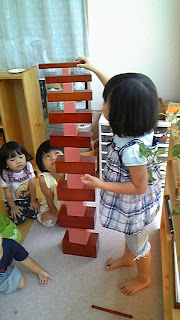 ピンクタワーと茶色の階段を使ってお仕事をしたときの様子です。一番太いと一番大きいを合わせて一番細いと一番小さなまで積み上げたり並べたりしながら感覚体験をしました。自分より高くなってくると「わー高い!」今度は床に並べて「長くなった!」と言う具合に直ぐに反応がかえってきます。と言うことで「Aちゃんより長いかな?」と子どもたちから提案がありAちゃんが横に寝てみました。次にBちゃんも寝てみましたがやっぱり足りません。じゃあ私も寝てみるで、3人でやっと『勝った!!』と大喜びでした。でも次の日の活動では背の高いお友だちがいたので二人で追い越すことが出来ました。